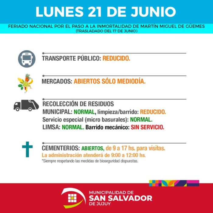 POR EL LUNES 21 DE JUNIOLa Municipalidad de San Salvador de Jujuy informa la modalidad de las prestaciones de servicios para el próximo lunes, feriado nacional, en conmemoración al pasó a la inmortalidad de Martín Miguel de Güemes. Si bien se conmemora el 17 de junio, y esta fecha está incorporada al calendario de feriados […]